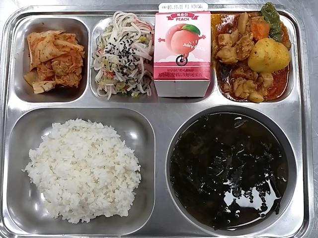 석식: 현미찹쌀밥, 미역된장국, 숙주맛살무침, 닭볶음, 배추김치, 쥬시쿨