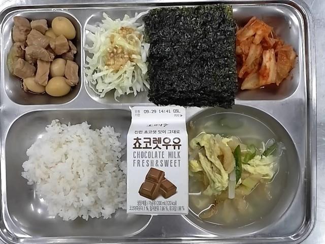 조식: 현미찹쌀밥, 북어채계란국, 메추리알돈육장조림, 구이김, 양배추샐러드, 초코우유