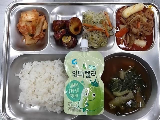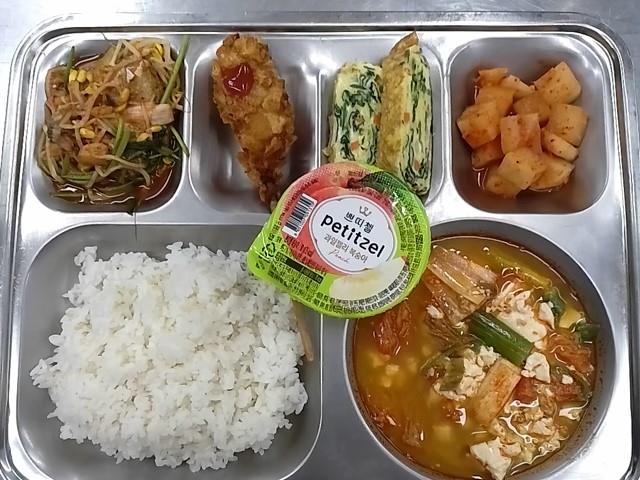 석식: 현미찹쌀밥, 순두부찌개, 코다리살콩나물찜, 시금치계란말이, 도깨비감자핫도그, 깍두기, 쁘띠첼