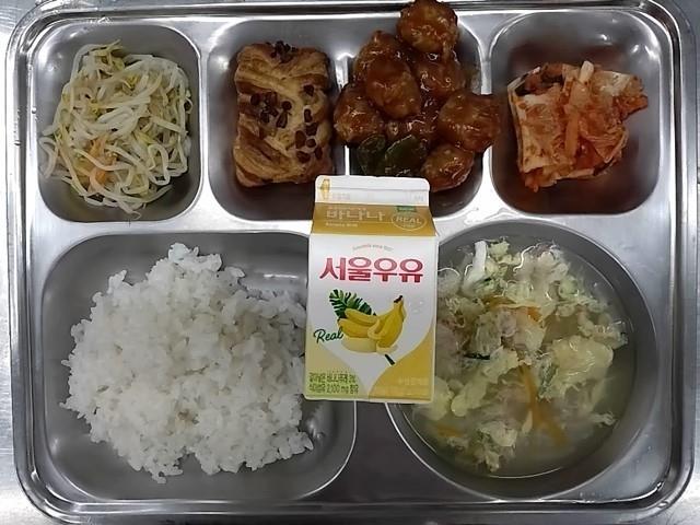 조식: 백미밥, 대게살스프, 함박소스새싹미트볼, 숙주나물, 배추김치, 메이플피칸, 바나나우유