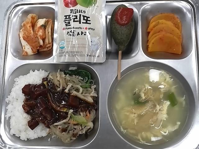 석식: 잡채덮밥+자장소스, 북어무국, 단무지무침, 배추김치, 우리살까망이핫도그, 석류사과주스