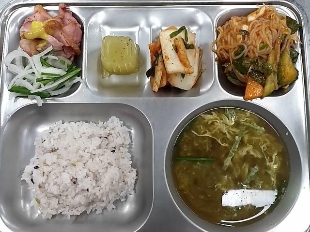 중식: 혼합잡곡밥, 올갱이부추된장국, 오리훈제+소스, 쫄면야채무침, 무쌈, 배추김치, 요거트푸딩