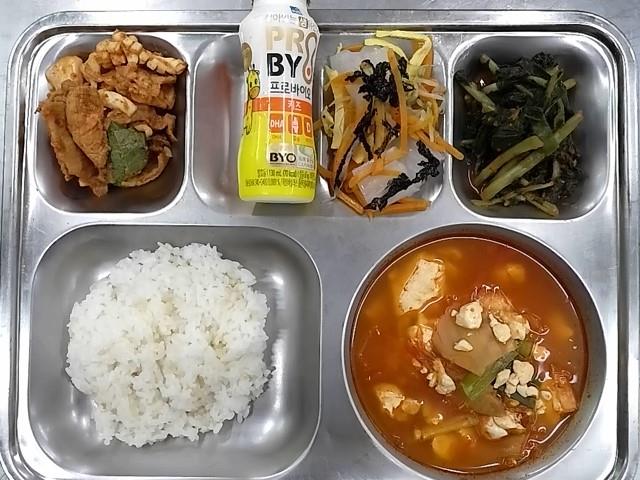 중식: 현미찹쌀밥, 순두부찌개, 청포묵김가루무침, 오삼불고기, 열무김치, 요구르트