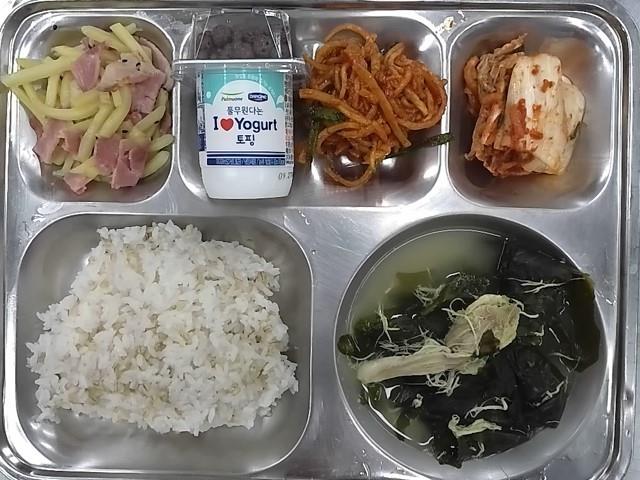 조식: 현미찹쌀밥, 닭고기미역국, 감자채베이컨볶음, 진미채볶음, 배추김치, 요거트토핑(초코)