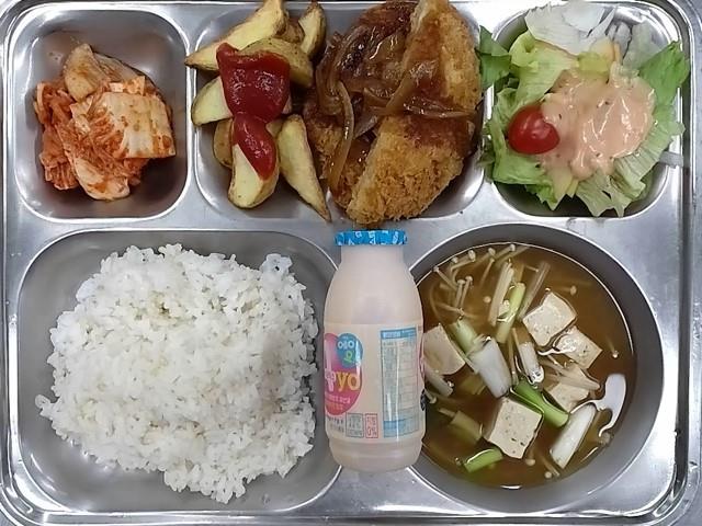중식: 현미찹쌀밥, 미소된장국, 등심치즈돈까스, 반달감자, 사과양상추샐러드, 배추김치, AYO요구르트