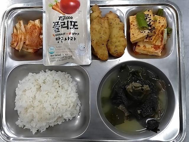 조식: 현미찹쌀밥, 쇠고기미역국, 두부조림, 케이준통살치킨텐더, 배추김치, 당근사과주스