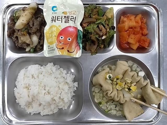 석식: 현미찹쌀밥, 꼬치어묵국, 궁중떡볶이, 도토리묵김치무침, 깍두기, 망고워터젤리