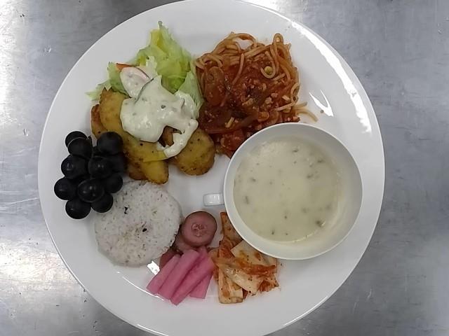 중식: 미트소스스파게티, 버섯스프, 삼색모듬피클, 치킨샐러드, 배추김치, 친환경포도