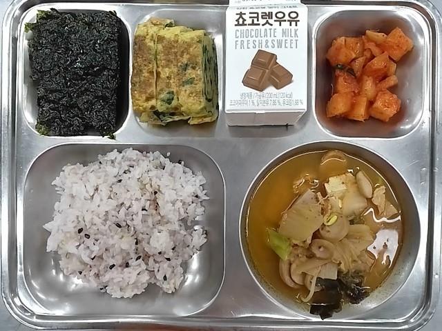 조식: 혼합잡곡밥, 부대찌개, 시금치계란말이, 구이김, 깍두기, 초코우유