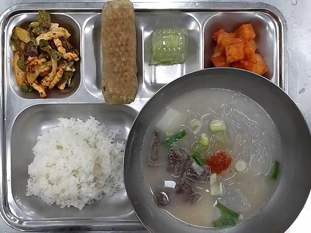 중식: 현미찹쌀밥, 설렁탕, 오징어야채무침, 불고기메밀전병, 깍두기, 골드키위푸딩