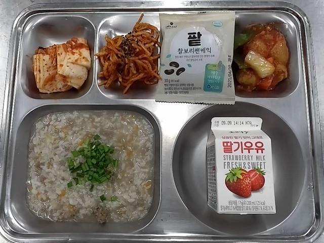 조식: 쇠고기야채죽, 진미채볶음, 토마토소스새싹미트볼, 배추김치, 딸기우유, 찰보리팬케익