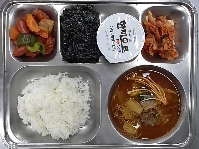 조식: 백미밥, 얼큰쇠고기무국, 비엔나야채볶음, 구이김, 배추김치, 요거트