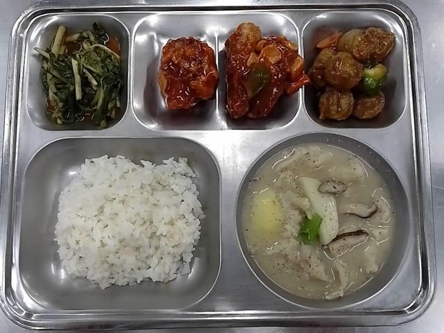 중식: 현미찹쌀밥, 들깨수제비국, 코다리강정, 함박소스새싹미트볼, 열무김치