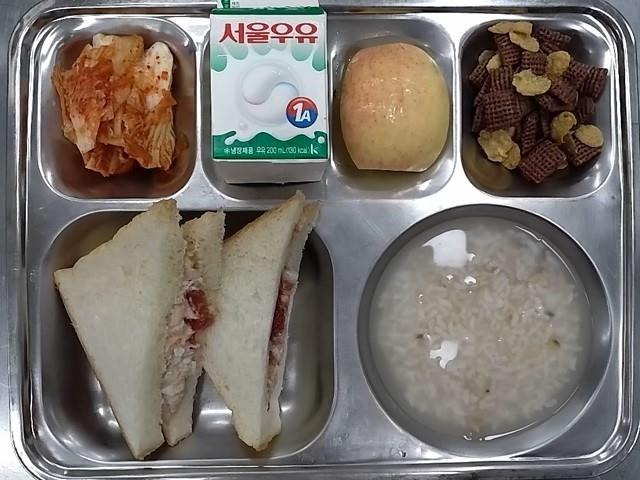 조식: 참치샌드위치, 시리얼+우유, 사과, 숭늉, 배추김치