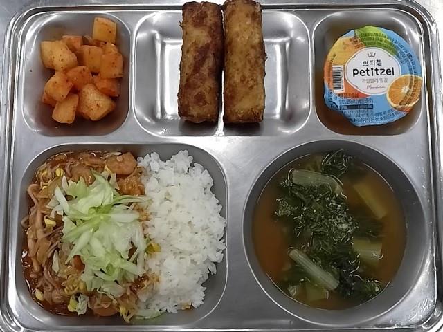 석식: 해물볶음덮밥, 콩가루배추국, 맘스프링짜조, 깍두기, 쁘띠첼