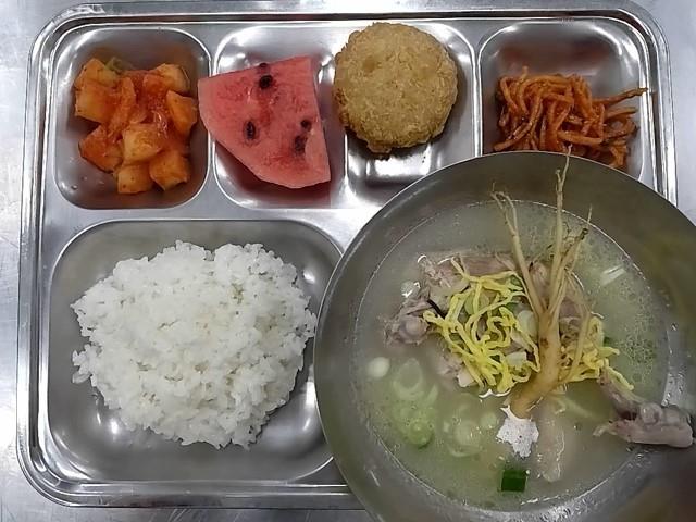중식: 통다리삼계탕, 진미채볶음, 고추잡채크로케타, 깍두기, 수박