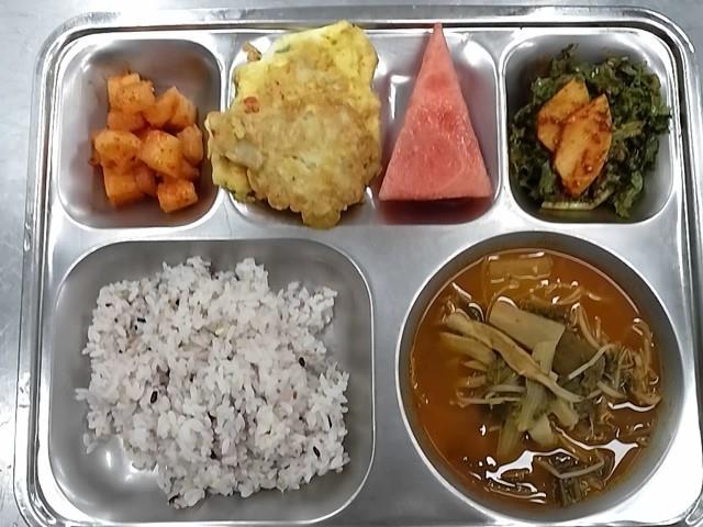 중식: 혼합잡곡밥, 육개장, 동태생선전, 치커리사과무침, 깍두기, 수박