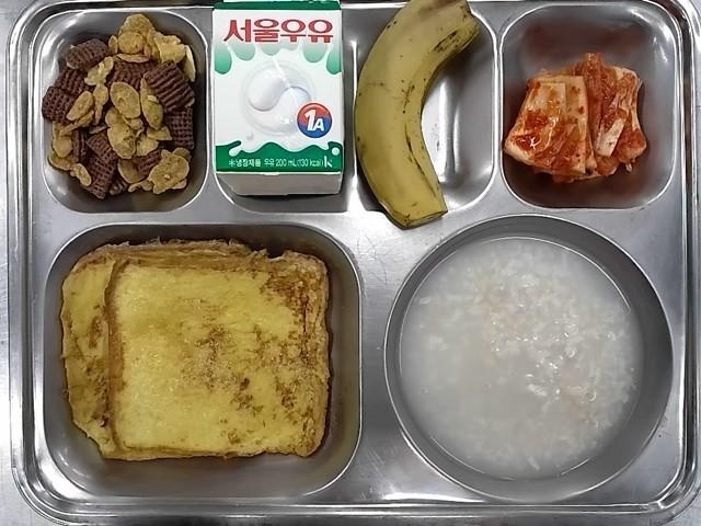 조식: 프랜치토스트, 시리얼+우유, 바나나, 숭늉, 배추김치