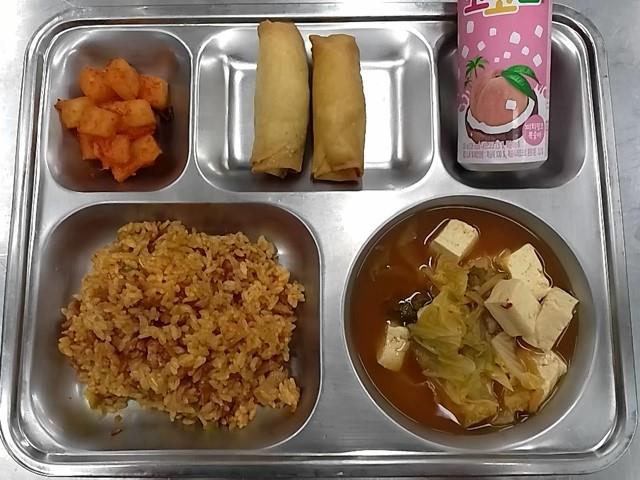석식: 오리훈제볶음밥, 두부김치국, 야채춘권, 깍두기, 코코팜