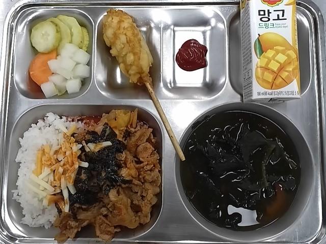 석식: 돈육김치치즈덮밥, 미역된장국, 삼색모듬피클, 도깨비감자핫도그, 망고쥬스