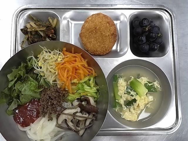 중식: 전주비빔밥, 달걀파국, 새우가스, 열무김치, 포도