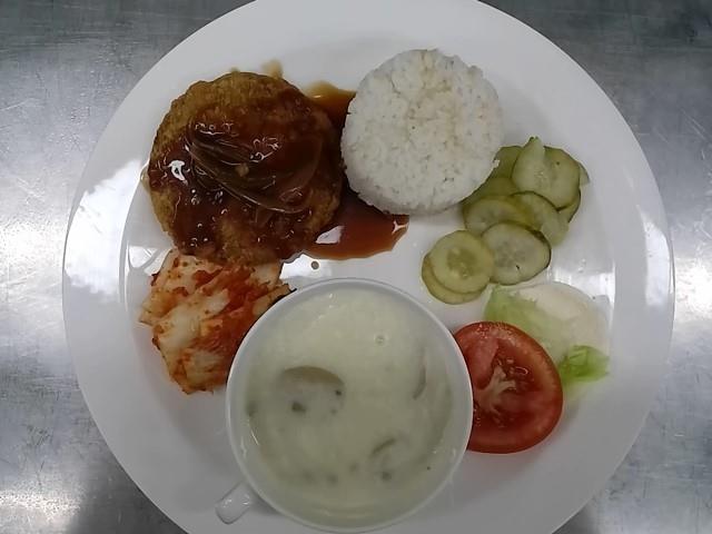 중식: 현미찹쌀밥, 버섯스프, 등심치즈돈까스, 오이피클, 토마토모짜렐라치즈샐러드, 배추김치