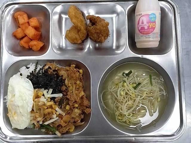 석식: 참치김치덮밥, 무콩나물국, 케이준통살치킨텐더, 깍두기, AYO 요구르트