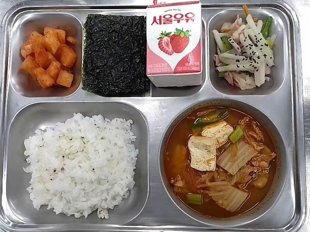 조식: 율무밥, 돈육김치찌개, 감자야채볶음, 구이김, 깍두기, 딸기우유