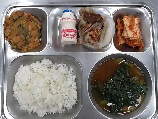 중식: 현미찹쌀밥, 근대된장국, 김치오징어전, 수육+새우젓, 무쌈, 배추김치, 요구르트
