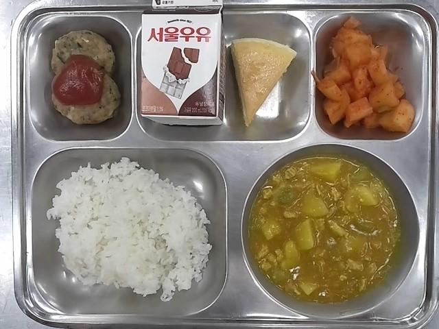 조식: 바몬드카레라이스, 깻잎주먹완자, 깍두기, 치즈케익, 초코우유