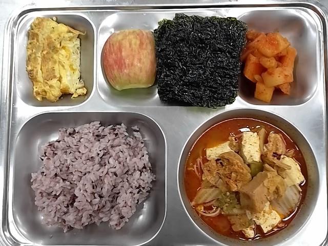 조식: 흑미밥, 부대찌개, 치즈계란말이, 구이김, 깍두기, 사과