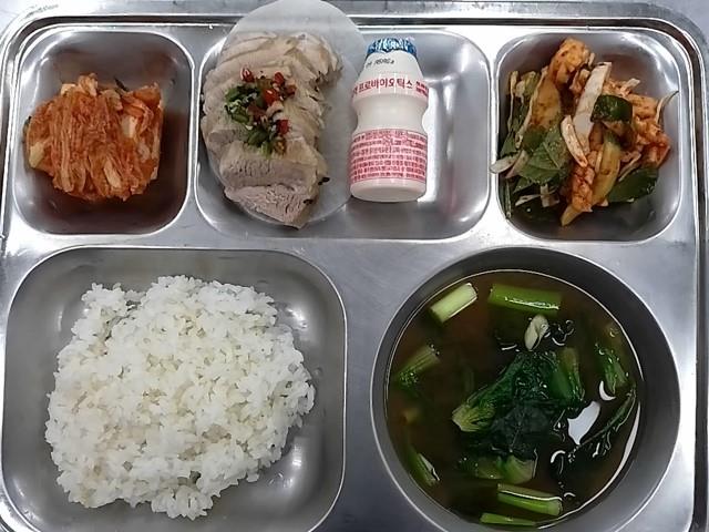 중식: 현미찹쌀밥, 시금치된장국, 수육+새우젓, 오징어야채무침, 무쌈, 배추김치, 요구르트