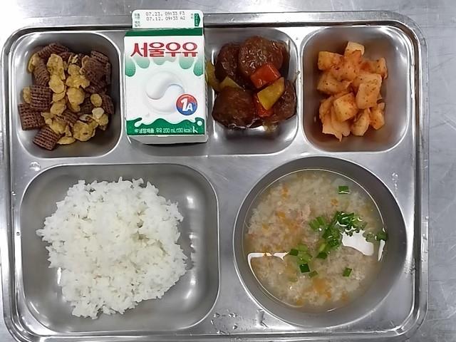 조식: 대게살죽, 마늘톡톡신찹스테이크, 깍두기, 시리얼+우유