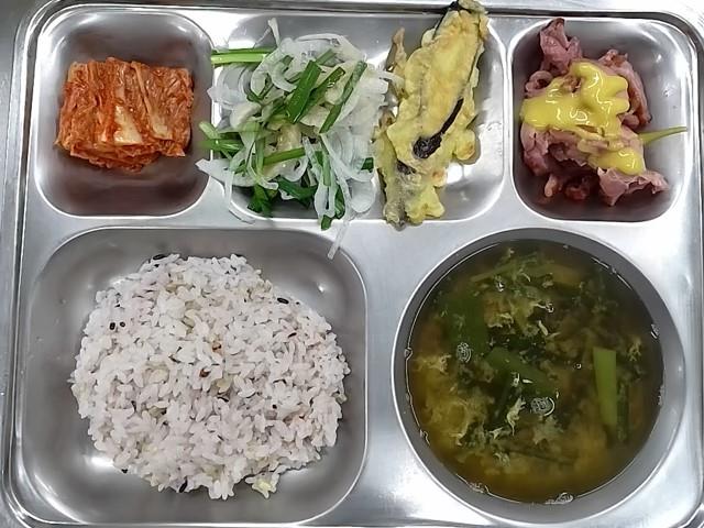 석식: 해물필라프, 꼬치어묵국, 단호박치즈크로켓, 단무지무침, 배추김치, 코코팜