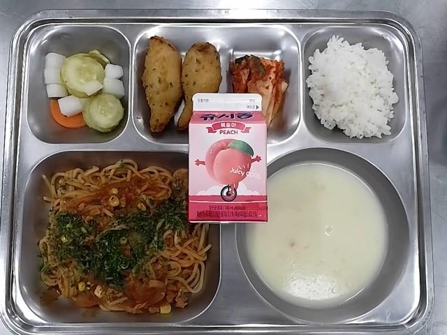 중식: 백미밥, 미트소스스파게티, 크림스프, 맘집게다리맛살, 삼색모듬피클, 쥬시쿨