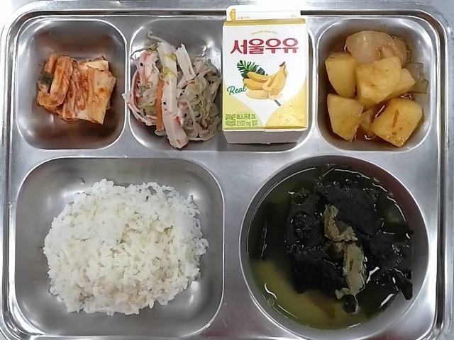 조식: 현미찹쌀밥, 쇠고기미역국, 감자조림, 숙주맛살무침, 배추김치, 바나나우유
