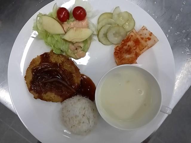중식: 현미찹쌀밥, 버섯스프, 등심치즈돈까스, 사과양상추샐러드, 오이피클, 배추김치