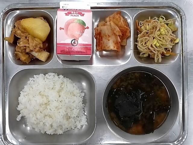 석식: 현미찹쌀밥, 미역된장국, 닭볶음, 콩나물무침, 배추김치, 쥬시쿨