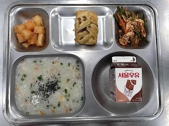 조식: 영양닭죽, 양배추부추무침, 깍두기, 메이플피칸, 초코우유