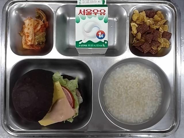 조식: 수제갈비살햄치즈블랙버거, 시리얼+우유, 숭늉, 배추김치