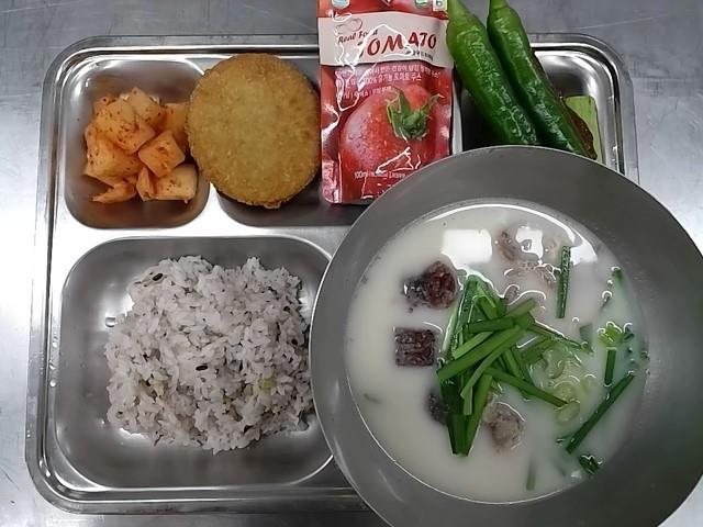 중식: 혼합잡곡밥, 신의주전통순대국, 새우가스, 아삭이고추+오이스틱+쌈장, 깍두기, 토마토주스