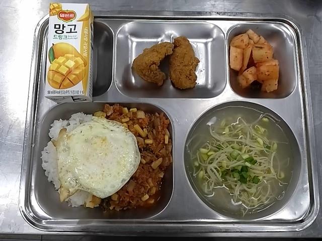 석식: 참치김치덮밥, 무콩나물국, 케이준통살치킨텐더, 깍두기, 델몬트망고주스