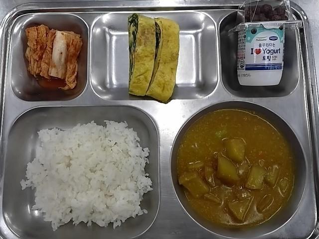 조식: 바몬드카레라이스, 시금치계란말이, 배추김치, 아이러브요거트토핑