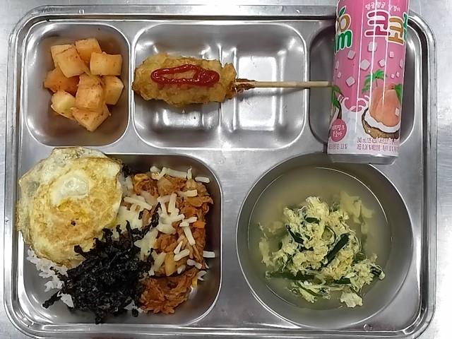 석식: 참치김치덮밥, 계란부추국, 도깨비감자핫도그, 깍두기, 코코팜