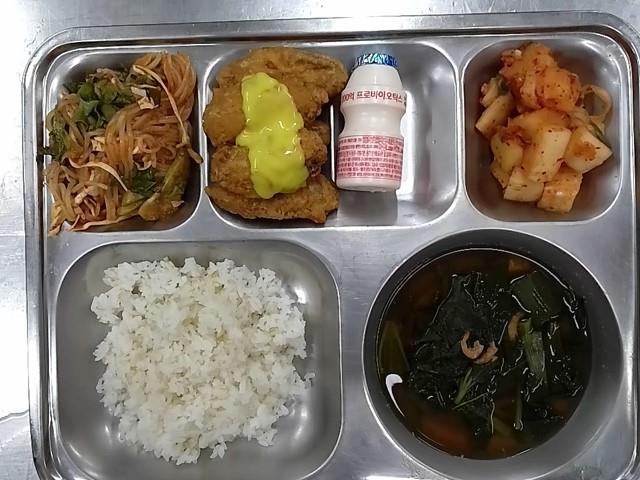 중식: 현미찹쌀밥, 건새우아욱된장국, 닭날개튀김+머스타드소스, 쫄면야채무침, 깍두기, 요구르트