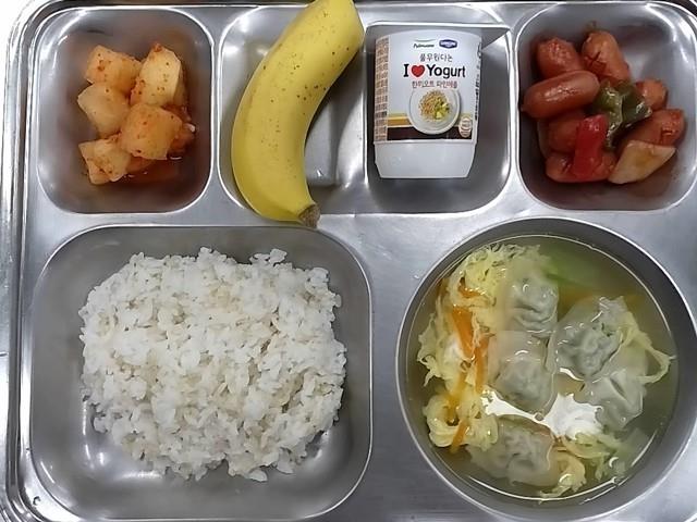 조식: 현미찹쌀밥, 꼬맹이만두국, 비엔나케첩조림, 깍두기, 바나나, 아이러브요거트