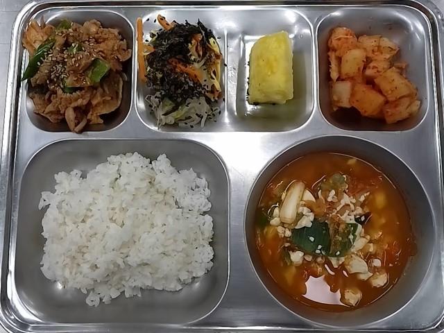중식: 현미찹쌀밥, 순두부찌개, 오삼불고기, 청포묵김가루무침, 깍두기, 골드파인애플