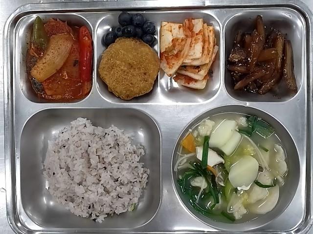 중식: 혼합잡곡밥, 버섯수제비국, 고등어무조림, 고추잡채크로케타, 우엉조림, 배추김치, 블루베리