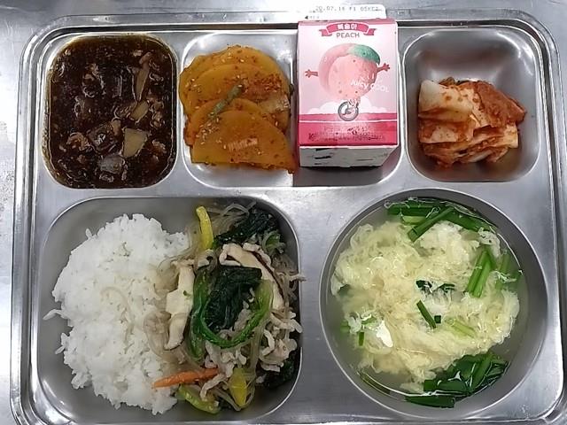 석식: 잡채덮밥+자장소스, 계란부추국, 단무지무침, 배추김치, 쥬시쿨