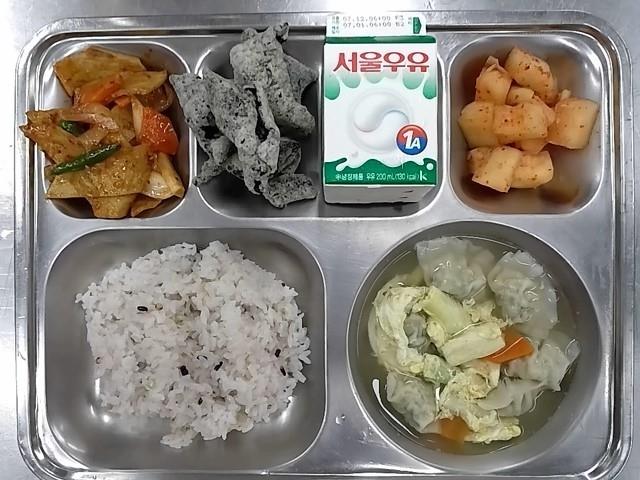 조식: 혼합잡곡밥, 꼬맹이만두국, 매콤어묵볶음, 김부각, 깍두기, 우유